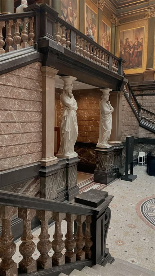 கட்டிடக்கலை - சுவர்கள் சிவப்பு -பழுப்பு பளிங்கில் வேலைநிறுத்தம் செய்யும் நரம்புகளுடன் அணிந்திருக்கின்றன.