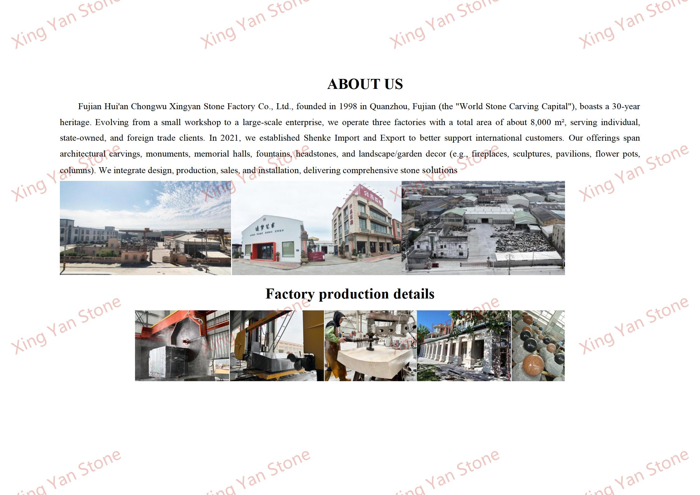 தனிப்பயனாக்குதல் சேவைகள்: சிலையின் அளவு மற்றும் பொருள் தேவைகளுக்கு ஏற்ப சரிசெய்யப்படலாம் (எ.கா., மற்ற கிரானைட் வகைகளுக்கு மாறுதல்), மற்றும் உரை வேலைப்பாடு (எ.கா., பெயர், நினைவுச் செய்தி) ஆதரிக்கப்படுகிறது;