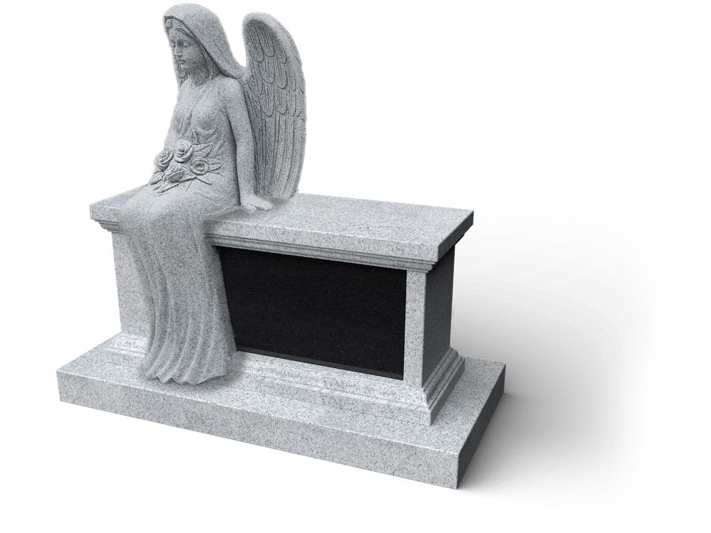 உட்கார்ந்த தேவதை சிலையுடன் கருப்பு கிரானைட் பெஞ்ச்